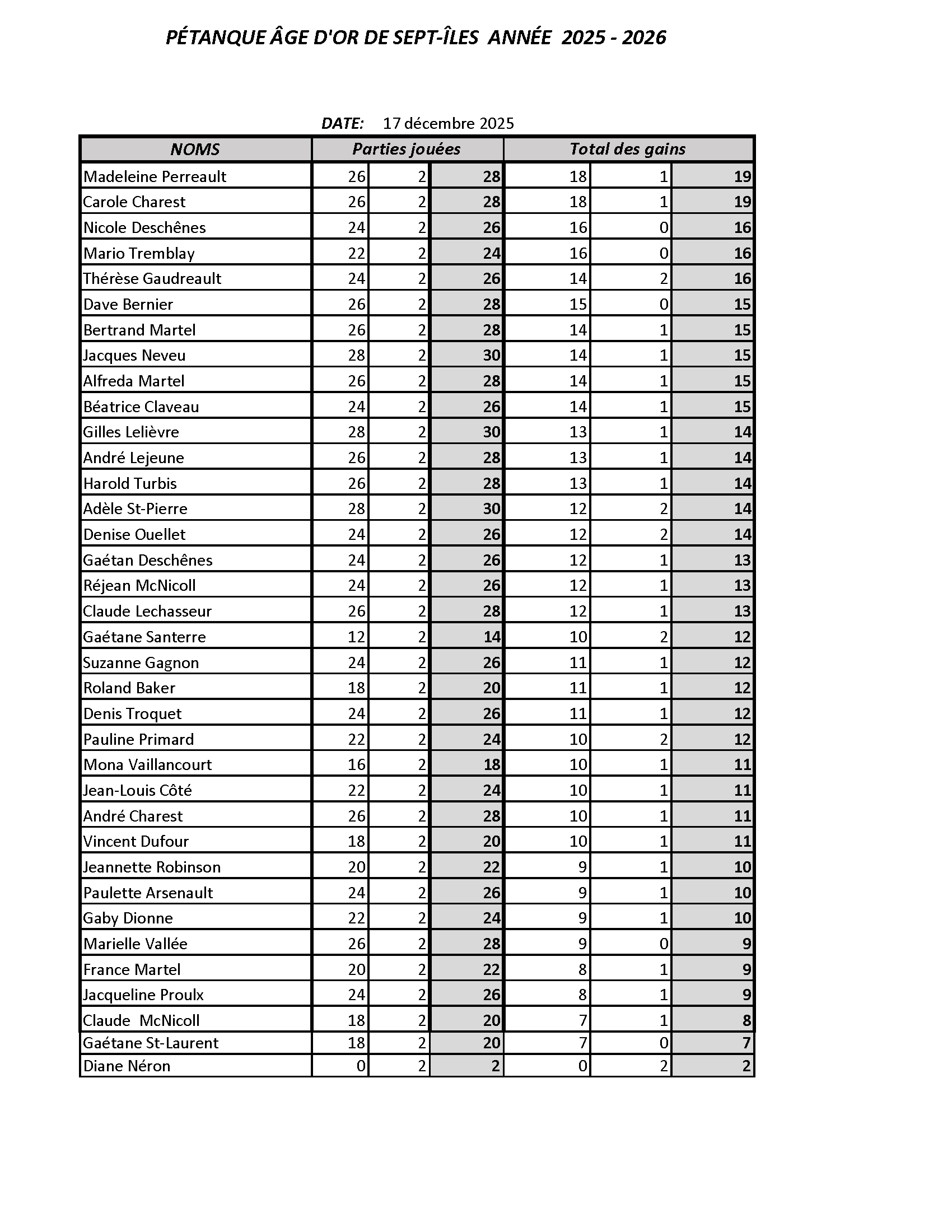 Pétanque intérieure - Statistiques